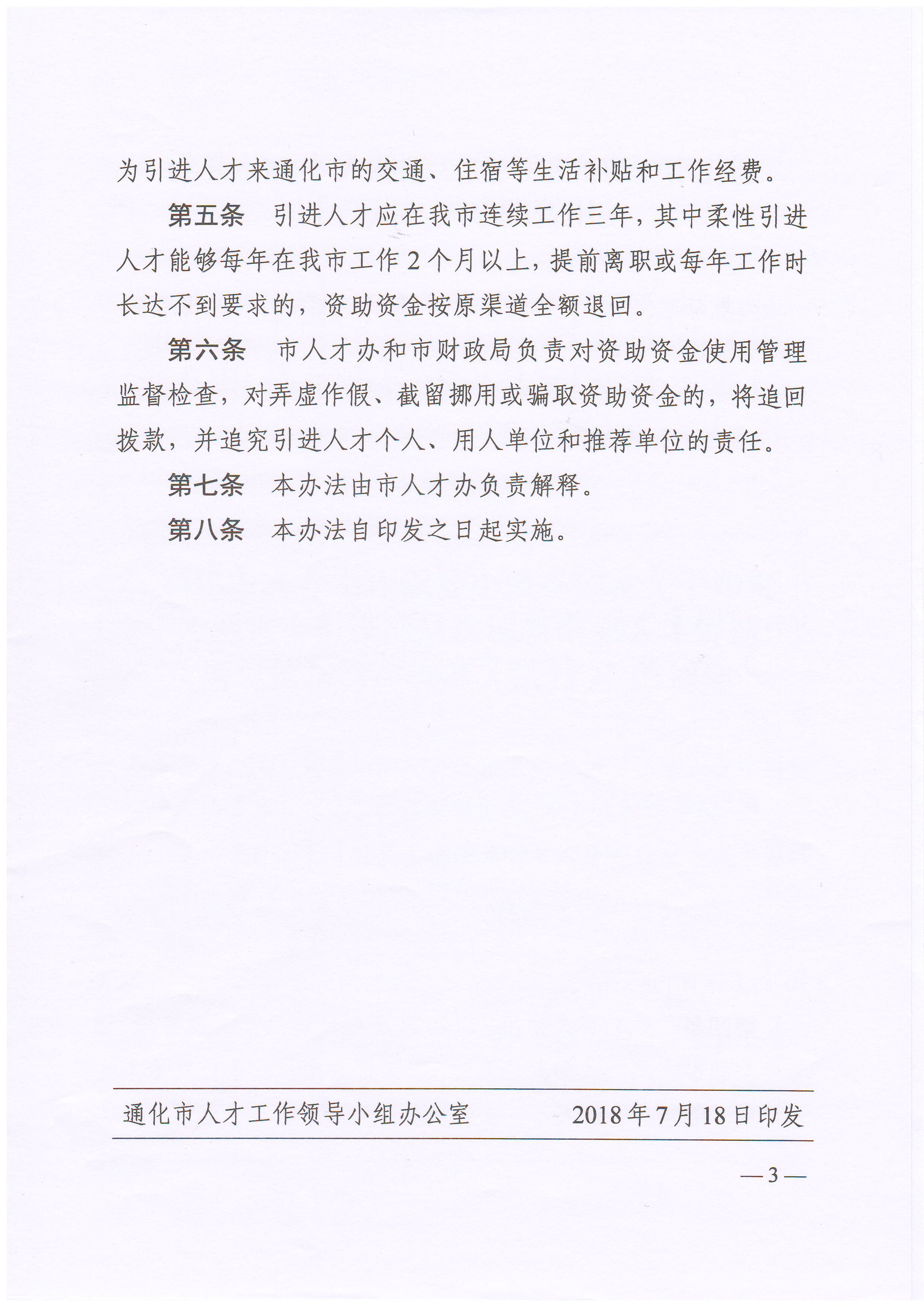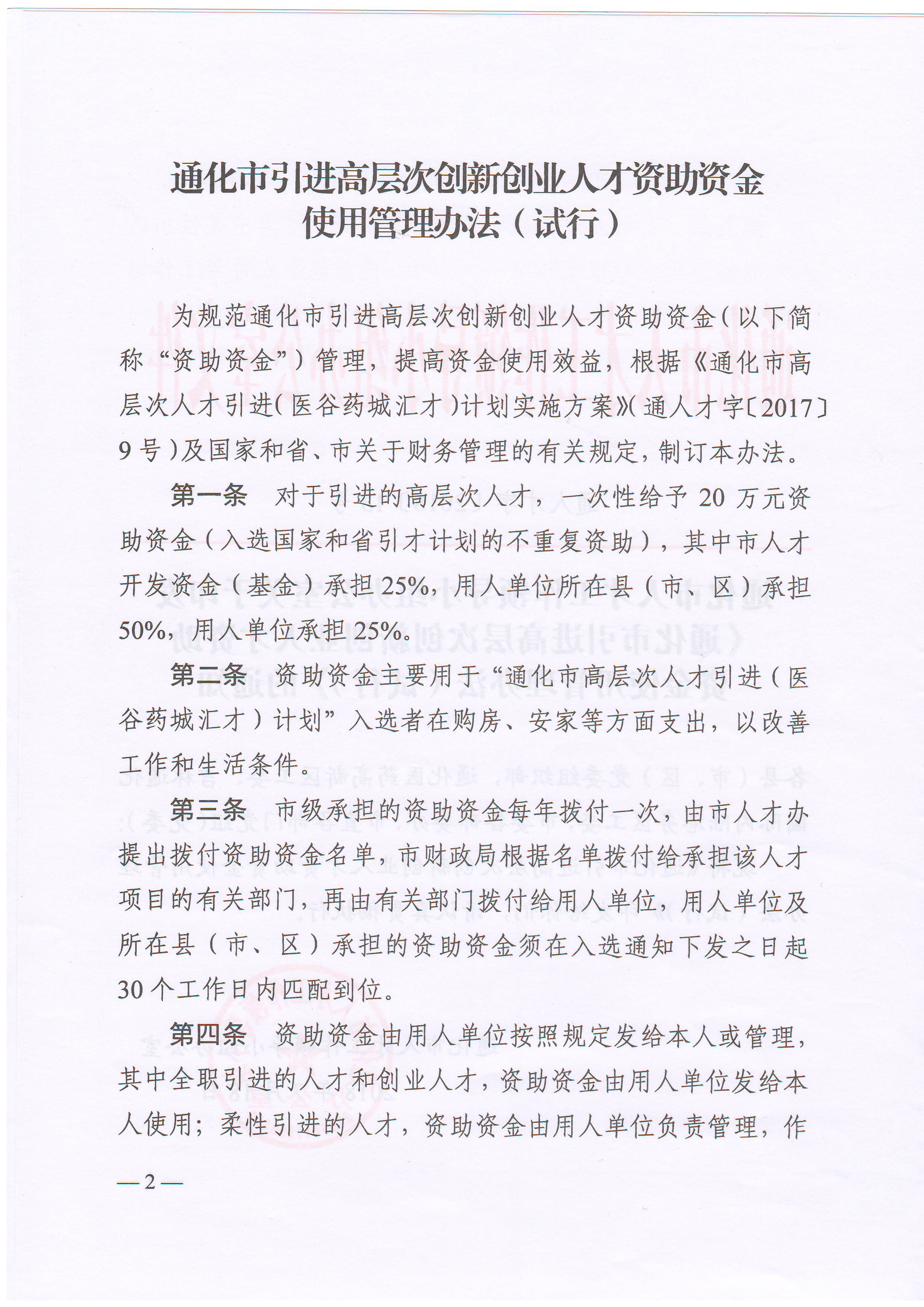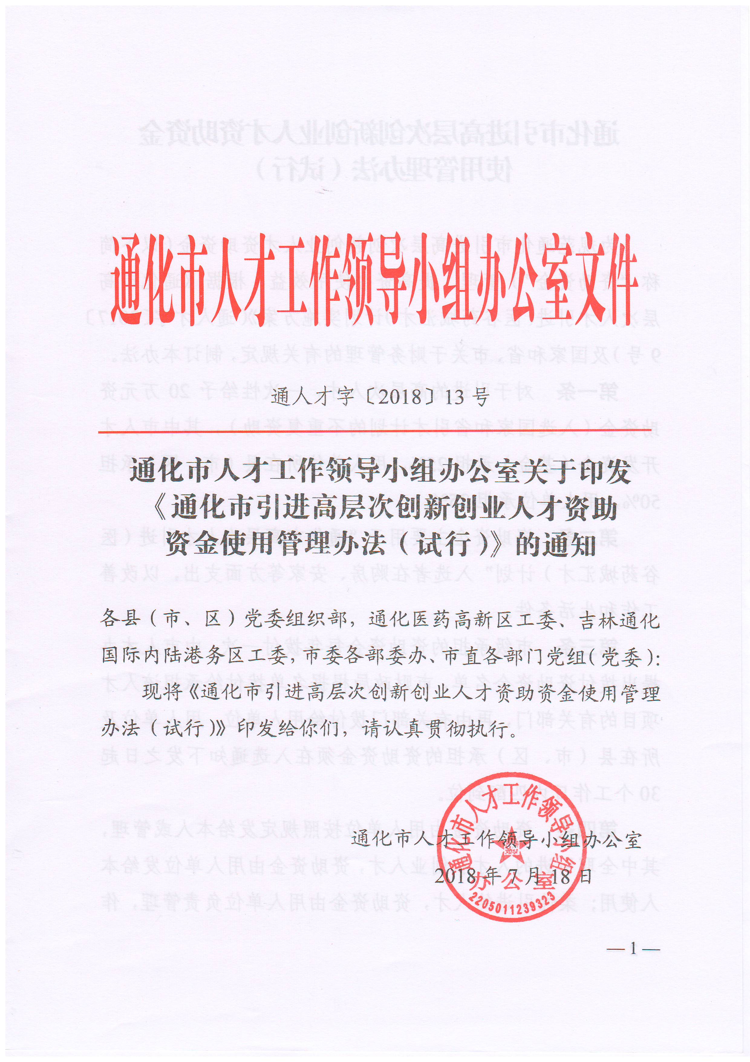 通化市人才工作领导小组办公室关于印发《通化市引进高层次创新创业人才资助资金使用管理办法(试行)》的通知