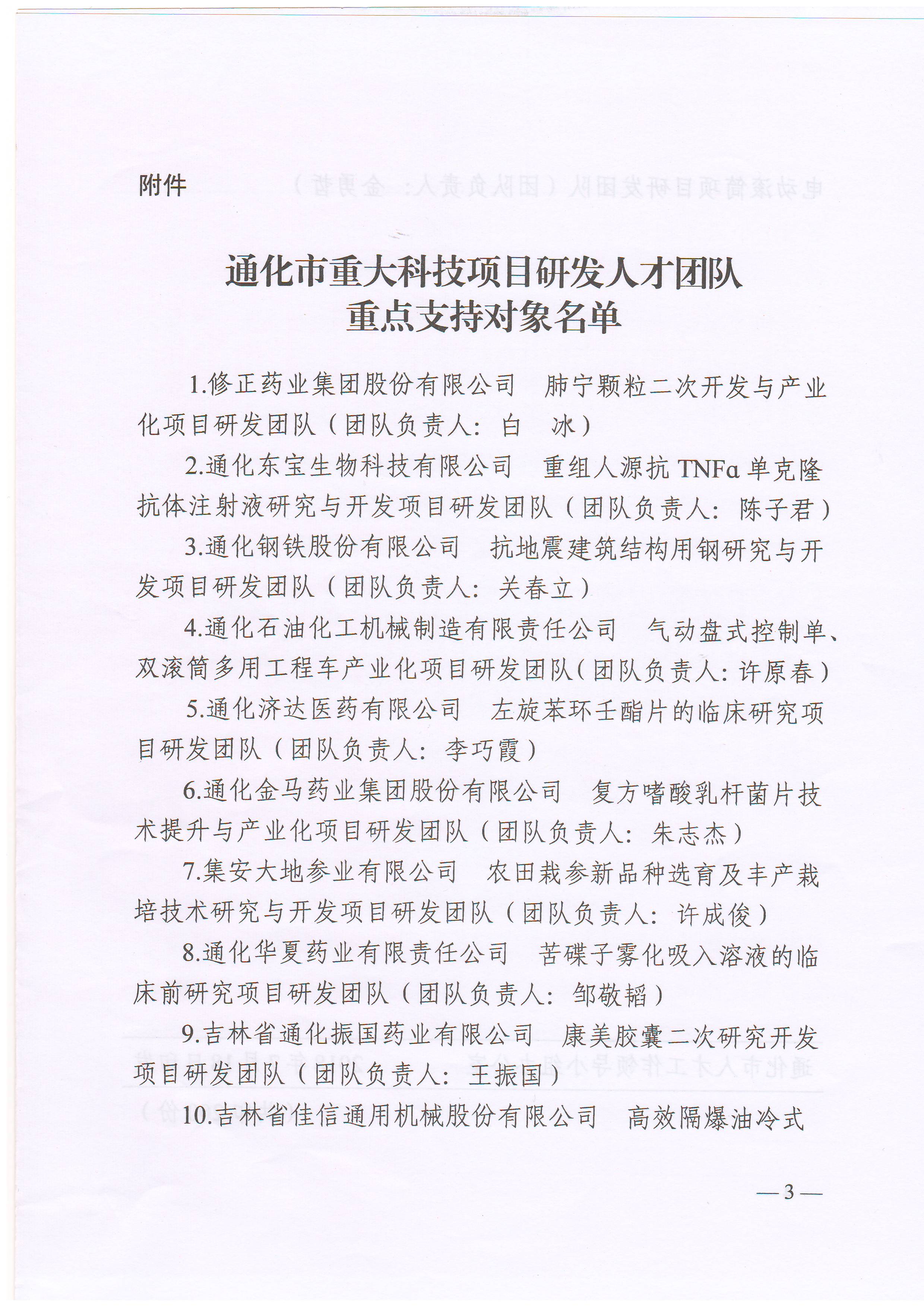通化市人才工作领导小组办公室关于重点支持修正药业肺宁颗粒二次开发团队等10个人才团队的决定